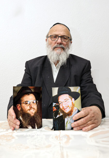"אנחנו ממשיכים קדימה" הרב נחמן הולצברג עם דיוקנאות של בנו ונכדו (צילום: אלחנן קוטלר)