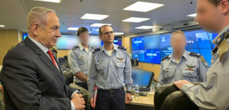 איזנקוט וגנץ אינם, דרעי נעדר, וגלנט מפנה עורף. נתניהו במטה המבצעים (הבור) של חיל האוויר בקריה צילום: קובי גדעון, לע"מ