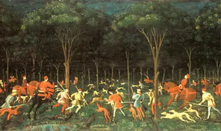 הציור שבו פתחנו, "הצייד", נוצר בידי אחד האומנים הראשונים שהשתמש בטריק הזה – הצייר פאולו אוצ'לו מפירנצה. ספר איטלקי עתיק שמשרטט את קורות חייו של אוצ'לו, מביא עדות מאשתו שתיארה את האובססיביות של בעלה בכל מה שקשור לפרספקטיבה של הציורים שלו, עד שהיה נשאר ער כל הלילה, כדי למצוא את נקודת המגוז המדויקת ביצירה שעליה עבד.